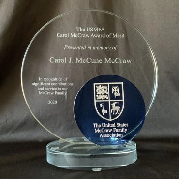 In September, 2019, the U.S. McCraw Family Association Board of Directors established an award honoring the late Carol McCune McCraw, chief author of the massive It Is McCraw Not McCraw work of genealogy. The board voted Carol the first recipient (posthumously) of the new award that bears her name: "The USMFA Carol McCraw Award of Merit." This award will be given at each biennial Reunion meeting to honor family members who have made significant contributions to our association or to society as a whole. Award recipients receive free Reunion registration. Nominations for the new award will be open for 2028 after the St Charles, Missouri, Reunion.